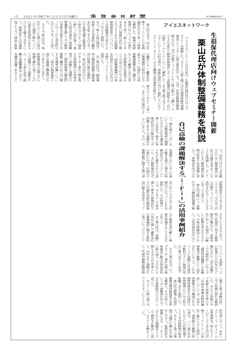 保険毎日新聞に掲載されました 2025年12月25日の保険毎日新聞に弊社保険代理店向けセミナーの記事が掲載されました。 アイエスネットワーク 生損保代理店向けウェブセミナー開催栗山氏が体制整備義務を解説自己点検の課題解決する「i-Fit」の活用事例紹介