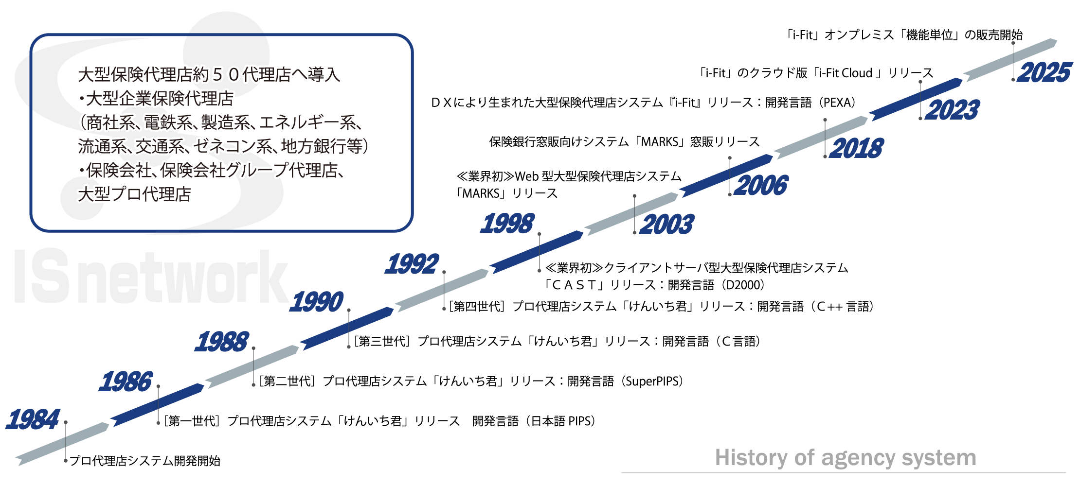 大型保険代理店システムの開発では35年の実績があり、今回ご紹介する「i-Fit(アイフィット)」は3世代目のシステムでございます。業界初のJavaで開発した2世代目大型保険代理店システム「MARKS(マークス)」はWeb型の大型保険代理店システムで約50社の導入実績があります。「i-Fit」は「MARKS」をベースに新機能追加・操作性の向上や将来性を目的にデジタルトランスフォーメーションによって新しく生まれ変わった商品です。